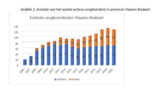 De provincie Vlaams-Brabant heeft een aanbod aan zorgboerderijen via Steunpunt Groene Zorg.126 zorgboerderijen zijn er actief (in 2021). Dit is meer dan een verdubbeling ten opzichte van 2008 (59). Het gaat zowel over klassieke landbouw- en tuinbouwbedrijven als over kleinere initiatieven zoals manèges, kinderboerderijen en hobbyboeren.